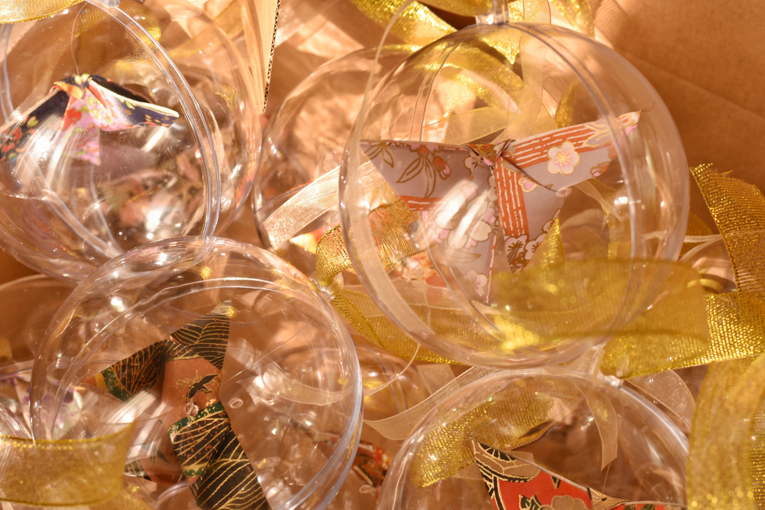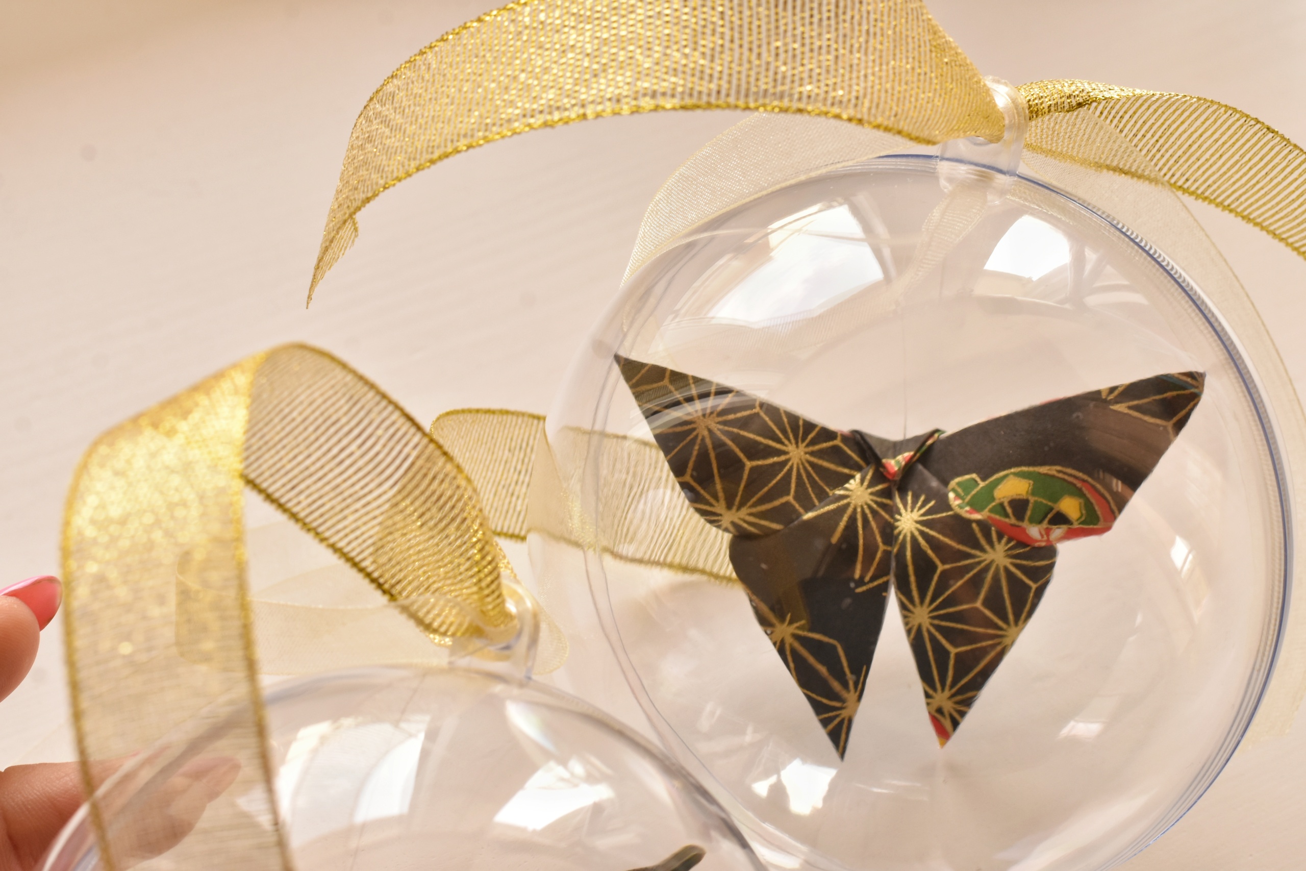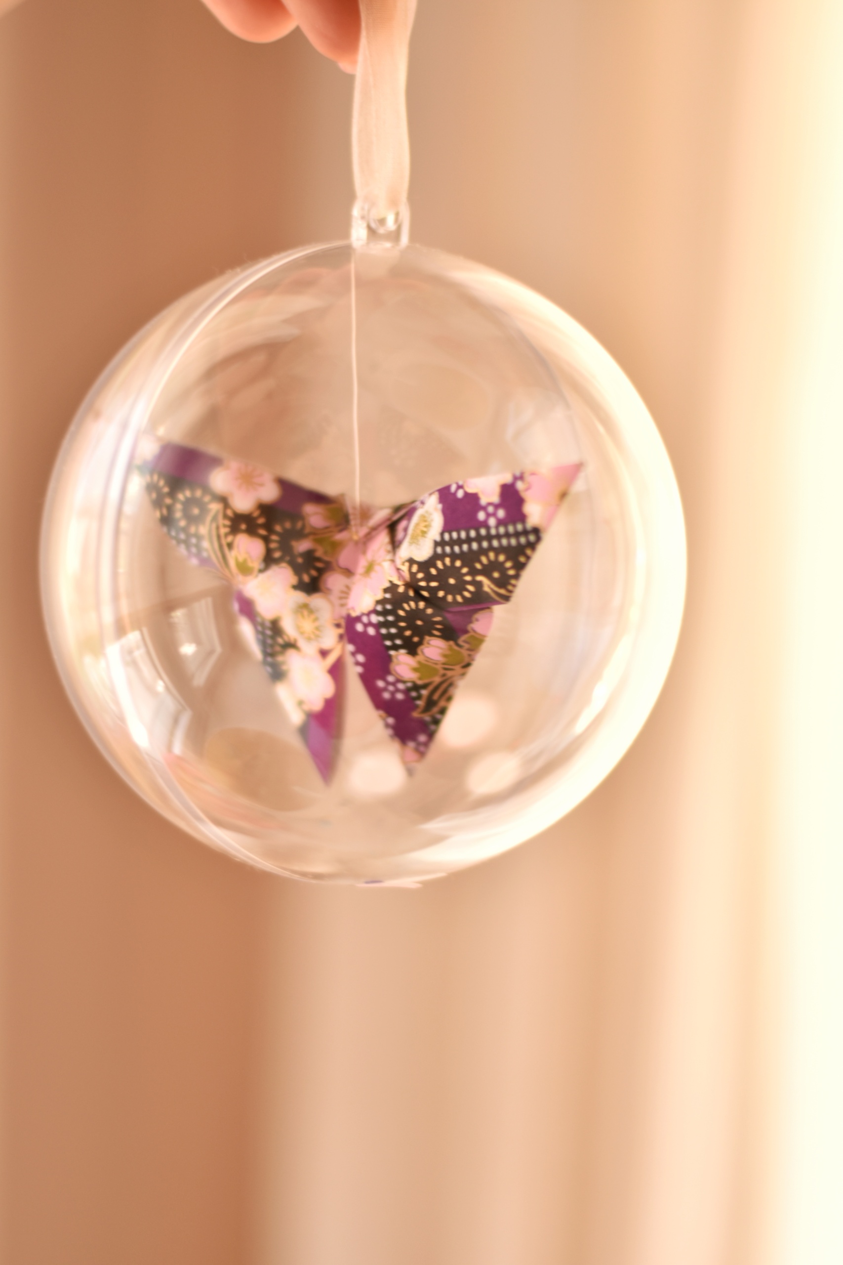 Η διάφανη μπάλα, είναι 10 εκατοστών, ενώ το χαρτί της πεταλούδας είναι από χειροποίητο ιαπωνικό χαρτί.