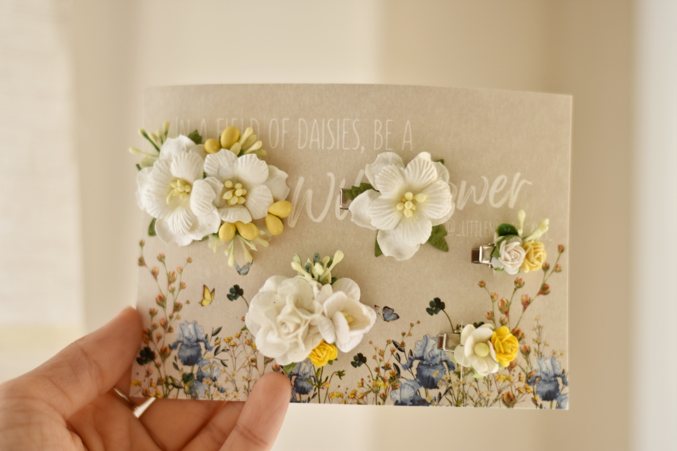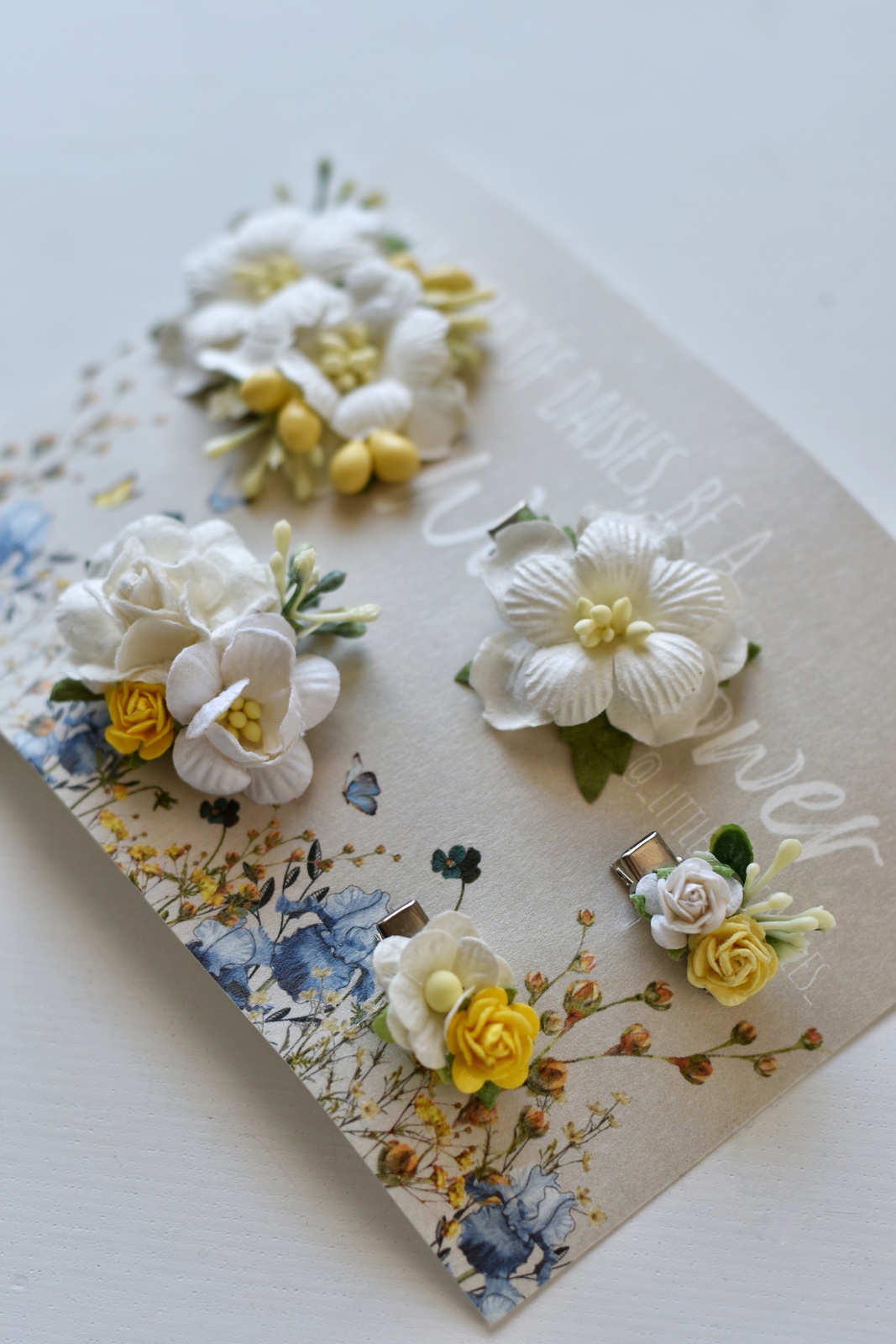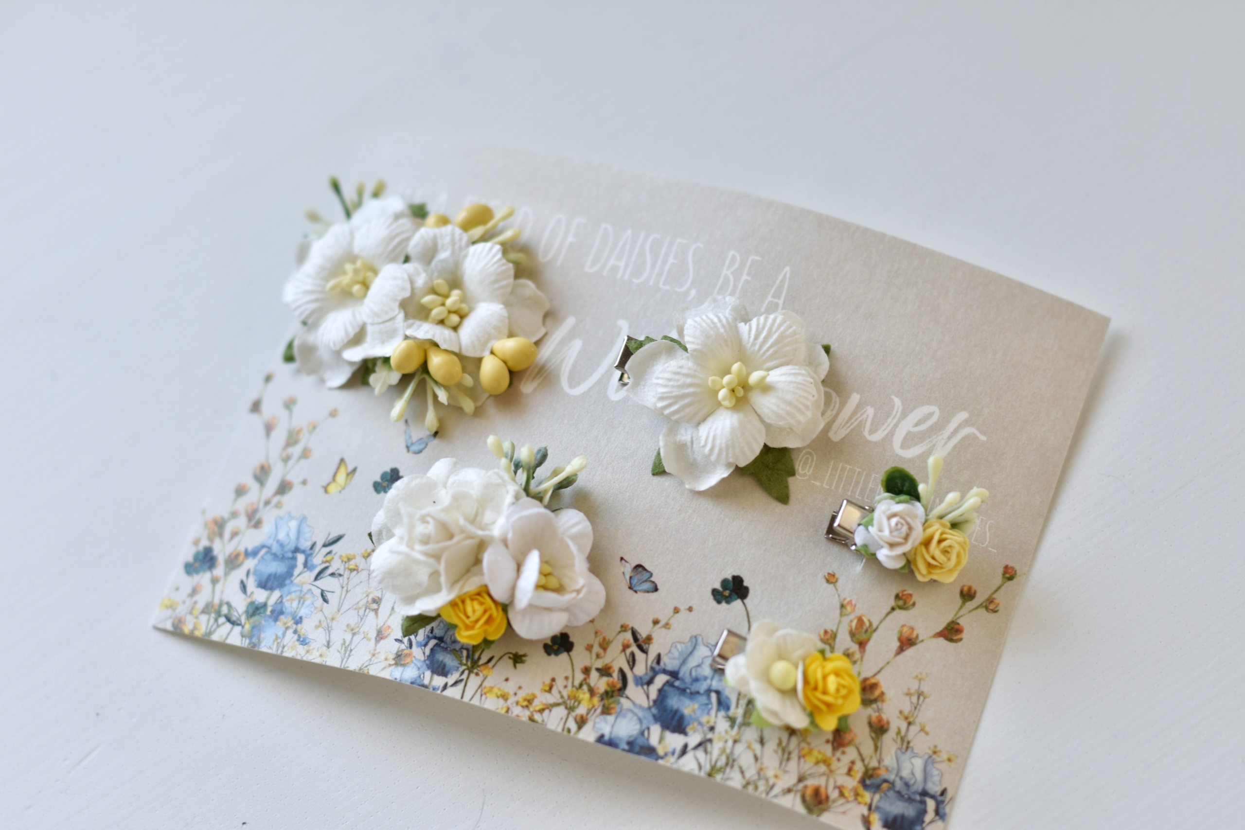 mini clip μαλλιών με λευκά και κίτρινα λουλουδάκια