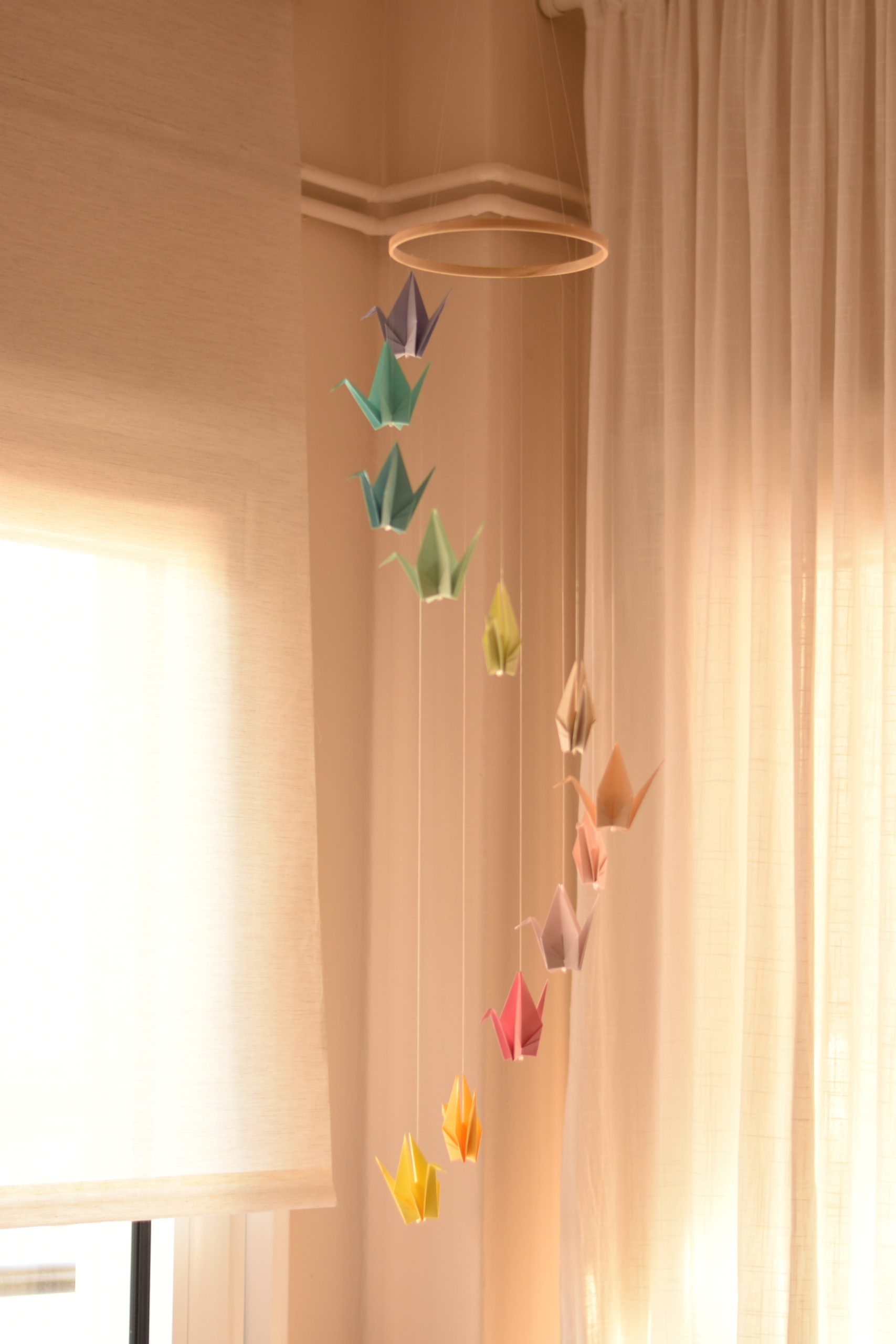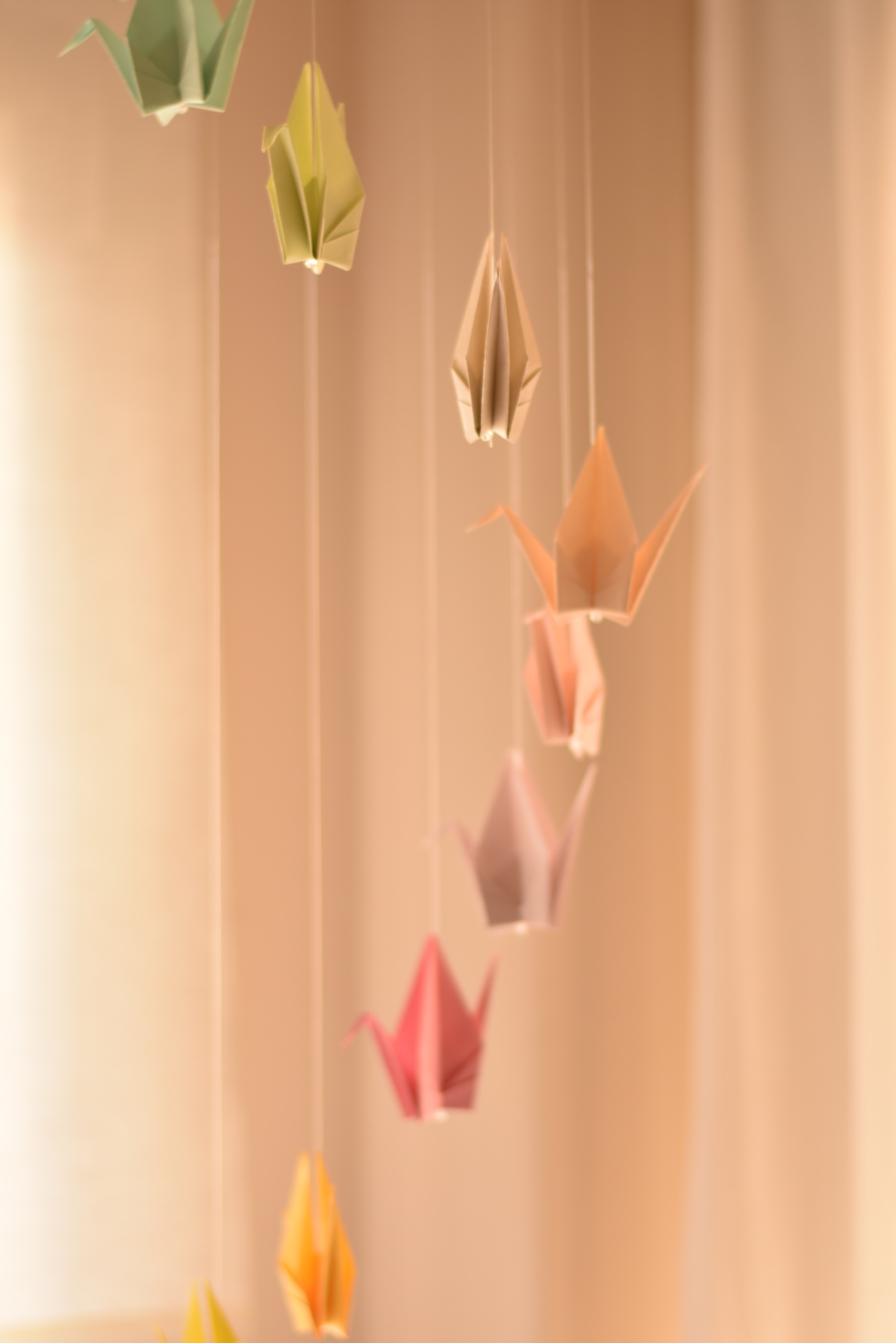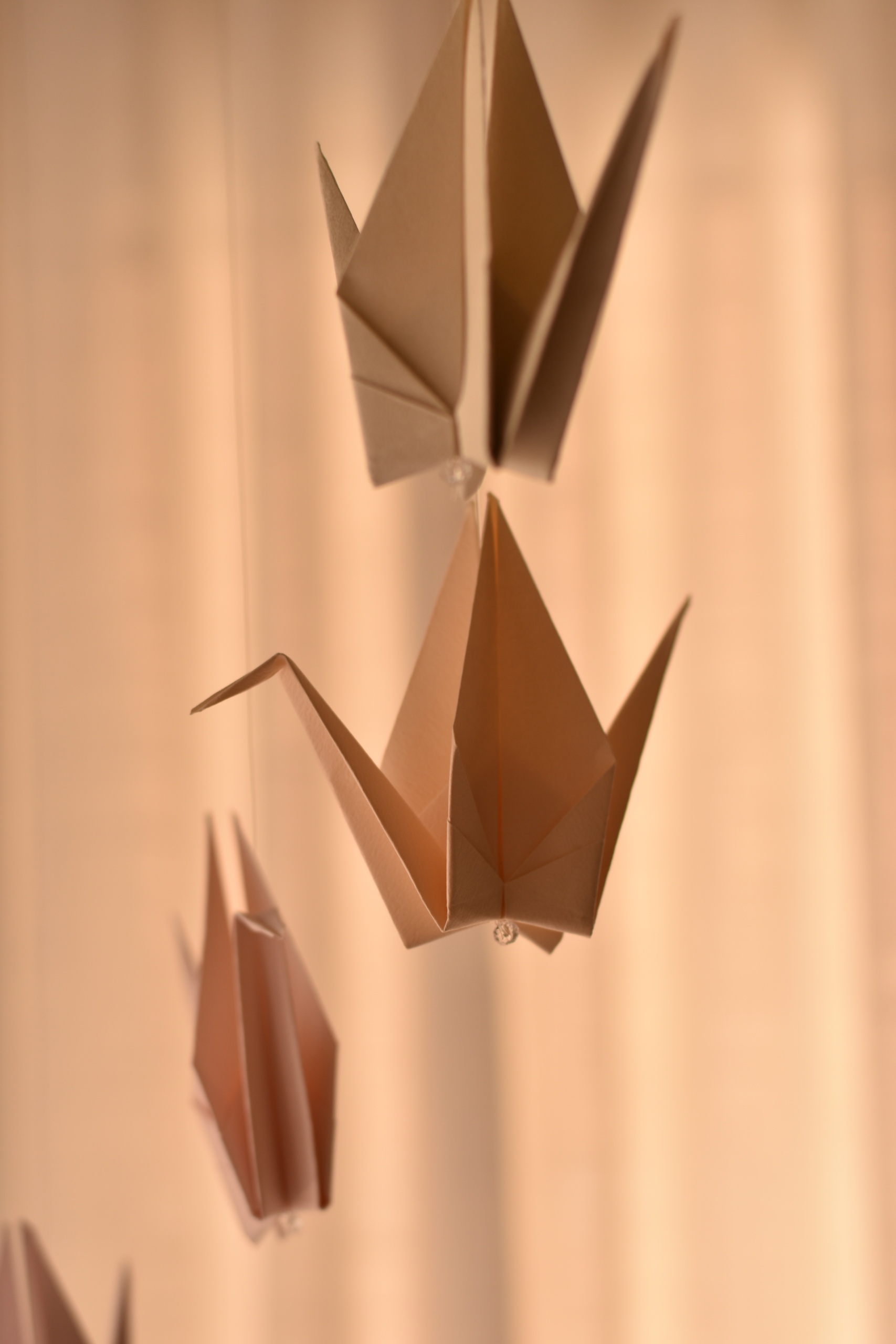 Το κάθε mobile αποτελείται από 12 cranes, διπλωμένα από ιαπωνικό χαρτί για origami.