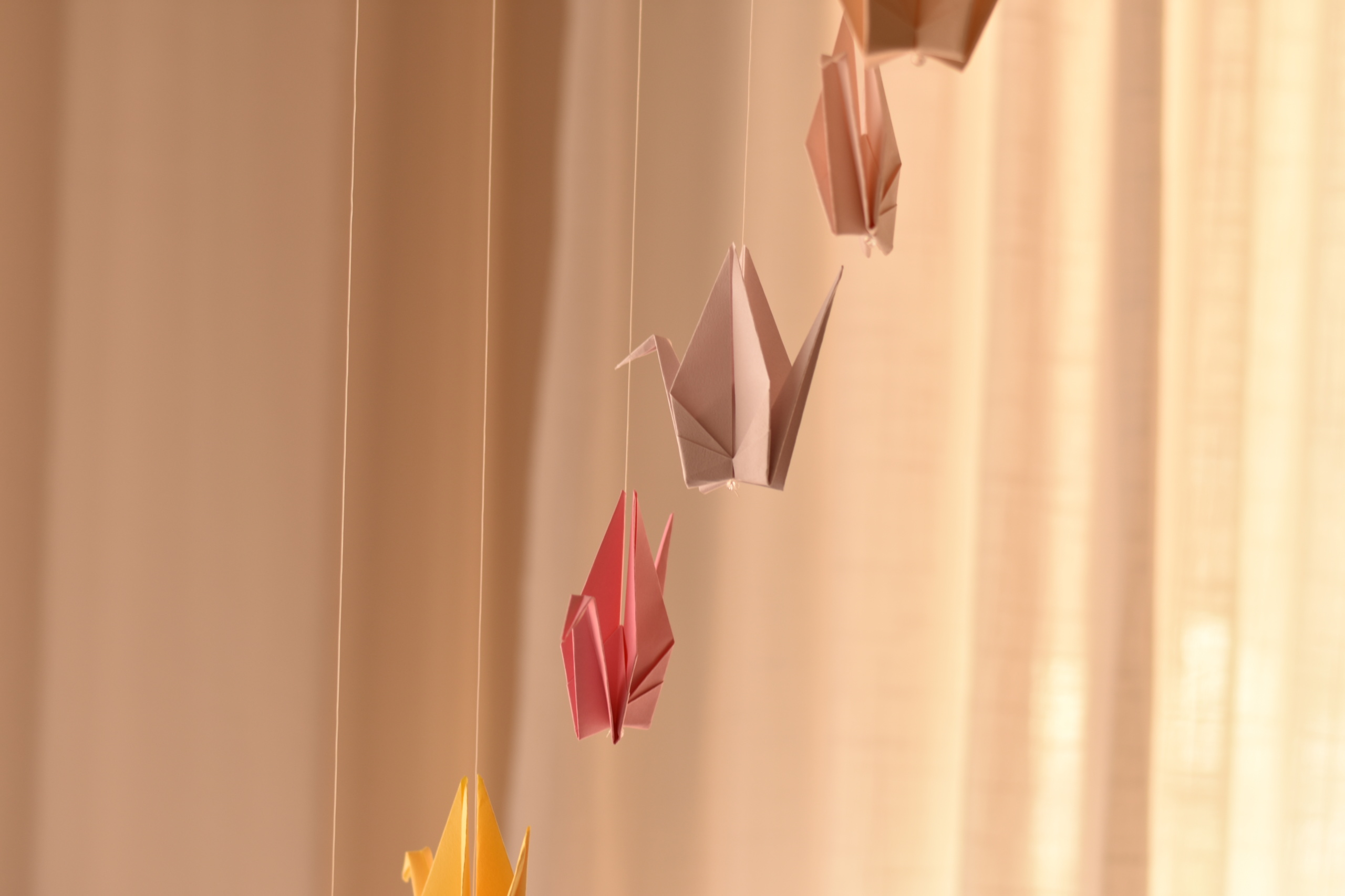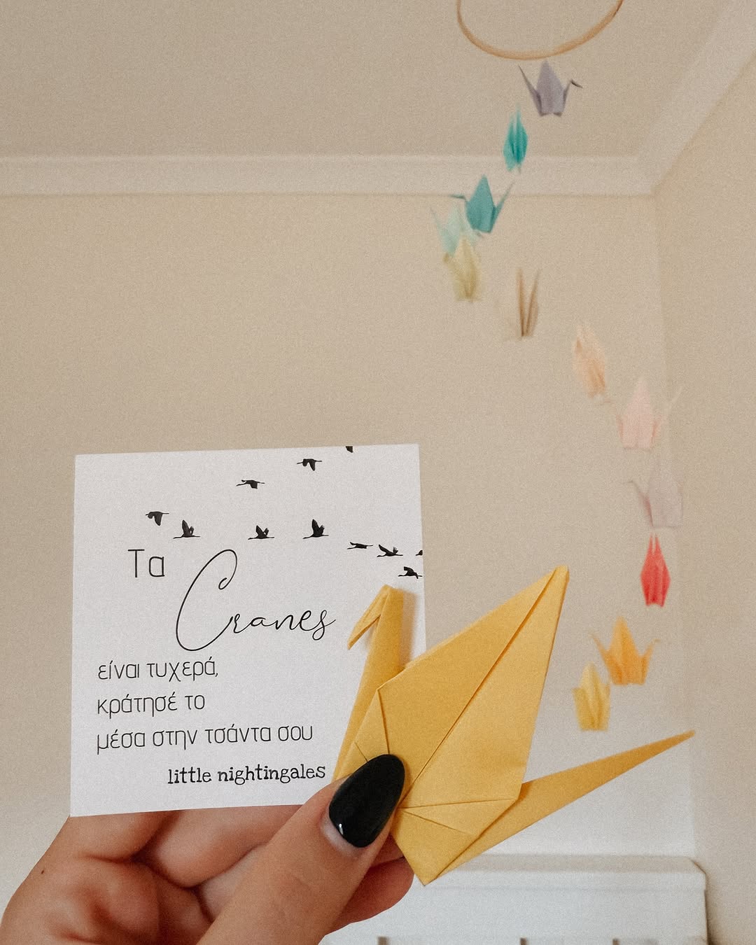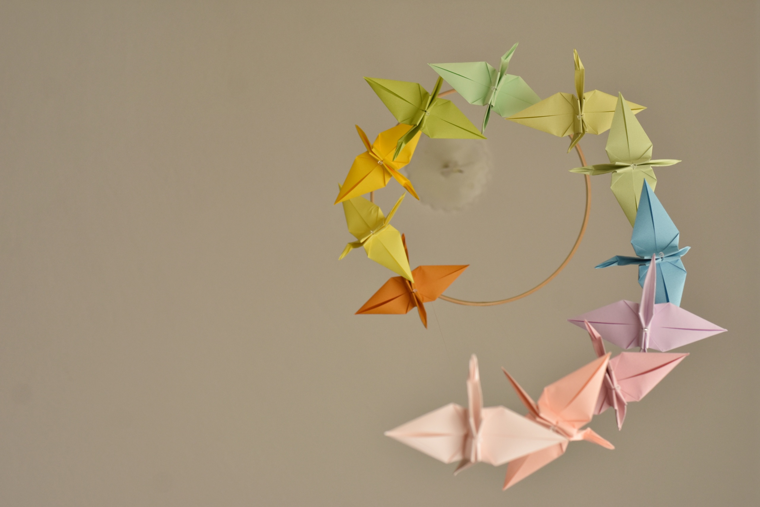 Το κάθε mobile αποτελείται από 12 cranes, διπλωμένα από ιαπωνικό χαρτί για origami.